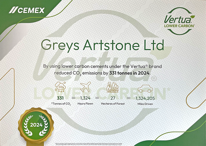 “We at Greys Artstone Ltd are proud to have received this certificate recognising the significant reduction in CO2 emissions achieved by our choice to use lower cardon cement in the manufacture of our roofing products.