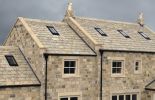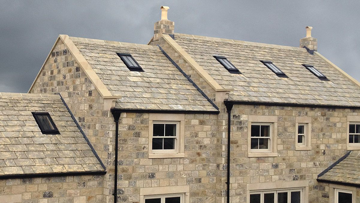 Greys Artstone roofing slates have been designed in consultation with professional roofers and architects, to achieve an easy to lay slating format, resulting in a coursed and diminishing stone slate roof.